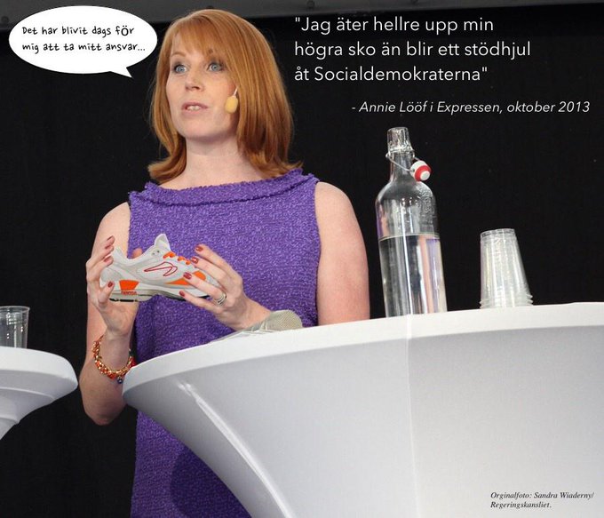 Det finns väl bara en princip bland sex+1-klöverns politiker. Den att strunta i alla principer när det passar. Väljarna skänker de nog ingen tanke mer än när det närmar sej nästa val. Hoppas skon smakar. Lite magvärk är väl för mycket att hoppas på. Med lite extra valfläsk till glider den nog ner. Skosnörena kan väl avnjutas i stil med Lady och Lufsen (Lövfen). Han har säkert en politisk köttbulle att knuffa över till henne så att hon kan tindra ännu mer med ögonen åt honom.