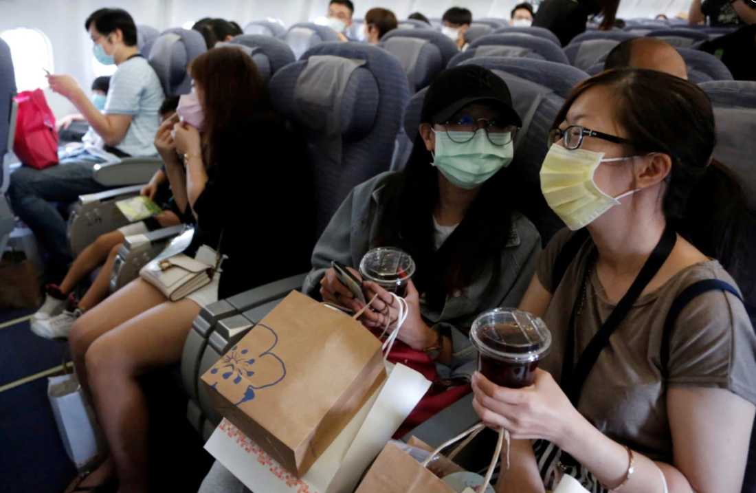 Inför den första resan hade 7 000 personer anmält sig. Av dessa valdes 60 ut slumpmässigt.TV-bilder från Reuters visar hur de munskyddsbärande turisterna får blippa sina fejkade boardingkort, köa till passkontrollen och sedan kliva på planet, som är av typen Airbus A330.